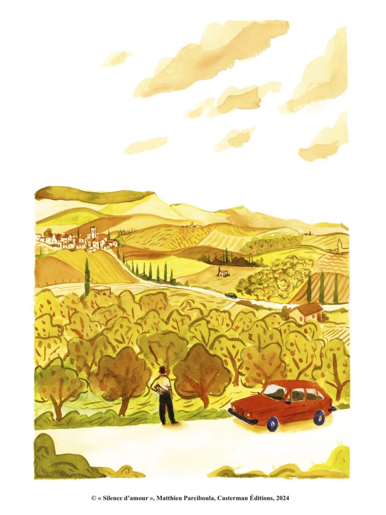 Matthieu Parciboula : Chez les nabis, c’est le travail sur la couleur qui m’influence. Dans Silence d’amour, j’ai essayé de faire modestement ce que les impressionnistes faisaient. Plutôt que de représenter l’Italie telle qu’elle existe, j’ai peint mon ressenti, mes impressions à la fois des lieux, des couleurs, de la nature, des gens…