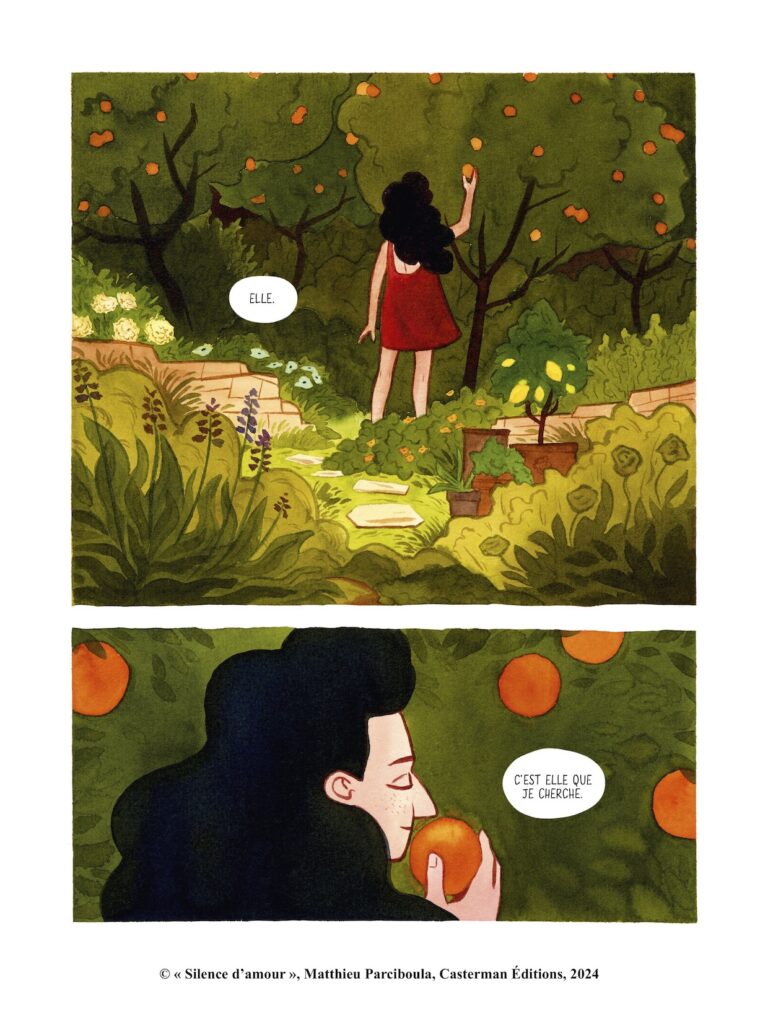 Matthieu Parciboula : Mon langage, c’est avant tout le dessin. Dans Silence d’amour, j’ai donc souhaité écrire peu, mais toujours juste, en essayant de trouver les assemblages de mots qui, tout en pudeur, pourraient peut-être provoquer chez le lecteur francophone une certaine émotion. Bien évidemment, il y a quelques mots en italien, cette langue que j’ai apprise en 2017, à l’université populaire, puis sur le tas, avec des amis. C’est pour moi la langue de la vitalité, du chant, de l’impulsivité peut-être aussi. C’est une langue qui me rend plus léger et insouciant. Il m’a semblé donc nécessaire de l’introduire dans le livre. C’est d’ailleurs la langue italienne qui a uni les deux personnages, Sofia étant la traductrice italienne des romans de Paul.