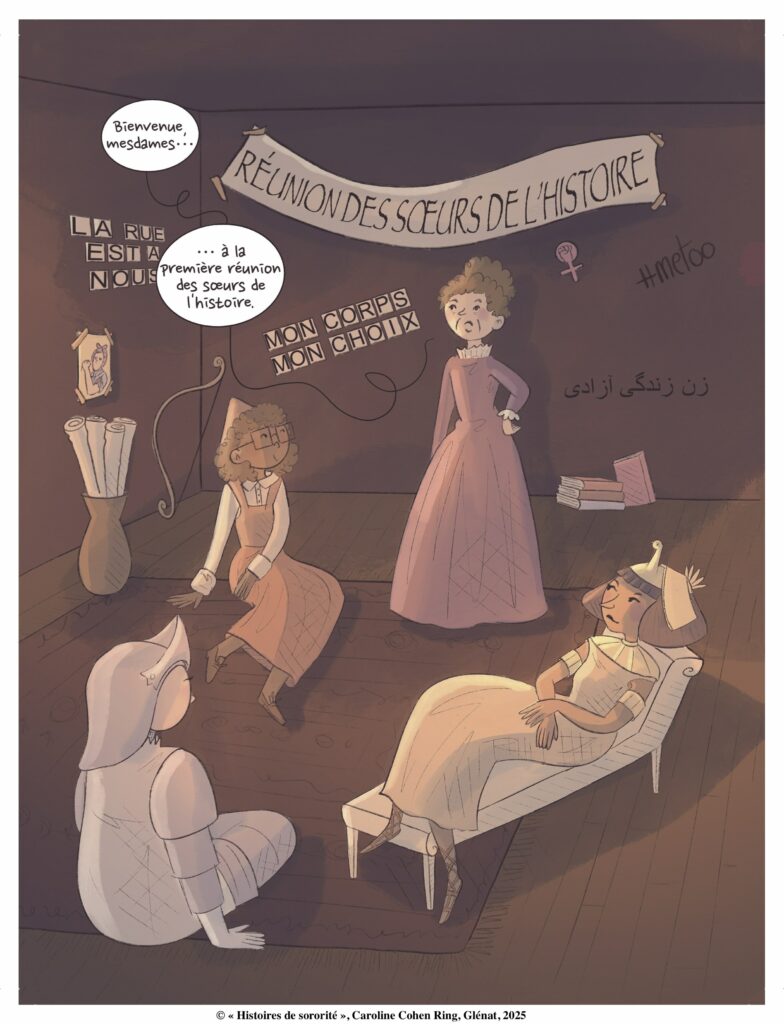 Caroline Cohen Ring, vous avez publié en janvier 2025 chez Glénat Histoires de sororité, une magnifique bande dessinée qui promeut l’importance de la sororité à travers le portrait de personnalité et figures ayant eu un rôle déterminant dans les luttes pour l’émancipation des femmes (la poétesse Sapho, la baronne Etta Palm, les suffragettes). Comment cet ouvrage est-il né ?
