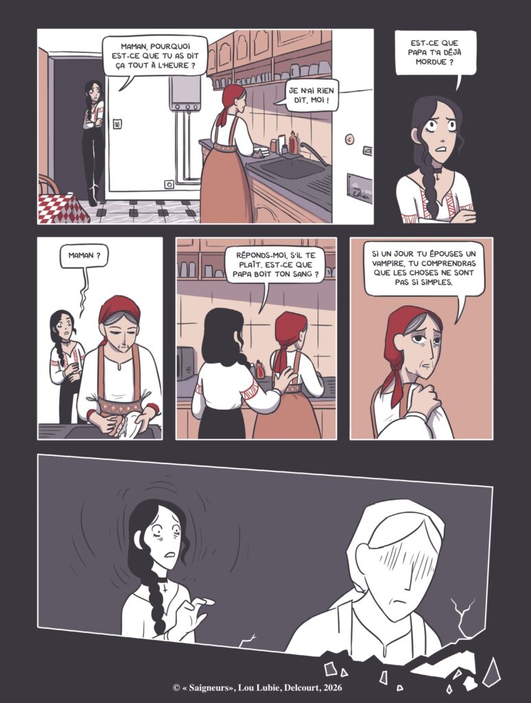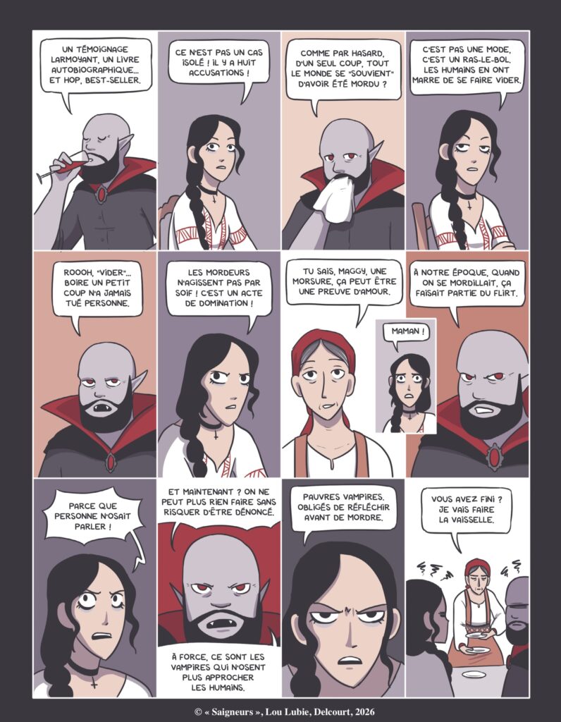 Lou Lubie : La figure du vampire est intéressante parce que dans les récits dans lesquels il apparaît, notamment la légende de Dracula, on a toujours affaire à un seigneur puissant qui jouit d’un pouvoir immense par rapport aux humains considérés comme du bétail et donc souvent victimes de ces méfaits. C’est pour cela que c’est une figure actuellement convoquée par différentes autrices de bandes dessinées pour mettre en avant la lutte des classes (ex : Les moribonds de Florence Dupré La Tour) ou le véganisme (cf. Bloodless 100% sans sang de Valentine Gallardo). Moi, j’ai choisi de m’en emparer pour mettre en avant les effets du patriarcat dans la société.